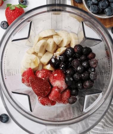 1. تمامی مواد شامل توتفرنگی منجمد، بلوبری منجمد، موز رسیده، شیر بادامهندی طبیعی، کره بادامهندی و تخم کتان آسیابشده را داخل دستگاه مخلوطکن (بلندر) بریزید.