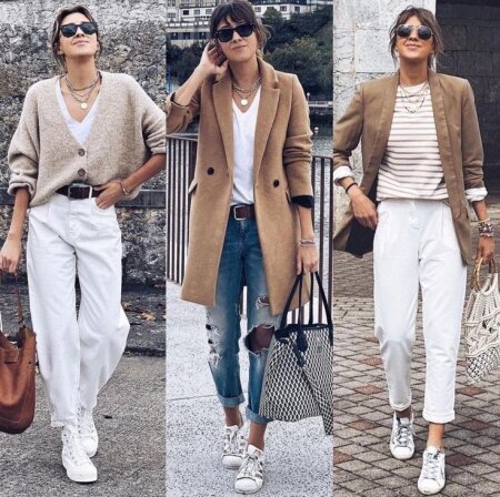 · از لباسهایی با رنگ شاد کنار سفید استفاده کنید؛ مثل شلوار مرجانی یا کیف فیروزهای